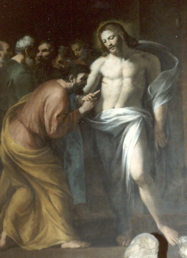 Today's Gospel also includes the famous episode of the disbelief of St. Thomas the Apostle. The Italian painter, Caravaggio, depicts this scene so well in his work entitled, Doubting Thomas. In the painting, St. Thomas leans over at our Lord and peering into His pierced side, slowly and cautiously places his hand into the side of our Lord in total awe of what he is doing. The other Apostles gathered around Thomas and our Lord look on, incredulous at what they are witnessing. Our Lord's gaze grasps at Thomas' hand and leads it into his pierced side, as if to invite Thomas to stop persisting in his unbelief. Today's Gospel and and this portrait tell us that our Lord's wounds of crucifixion were significant. After all, Doubting Thomas places his finger into the nail marks and his hand - his HAND - into the side of Christ. This episode shocks the Apostles for two reasons: first, they're still getting over the fact that our Lord is alive. Considering how brutal his death was, the fact that He is alive is awe-inspiring. The second reason that they're shocked is because in his glorified state, our Lord reveals to the Apostles a totally new mode of existence - the Resurrected state. At first the Apostles think that they are seeing a ghost, which suggest that our Lord is appearing to them in a vision, but has no real body. However, by placing his hand in our Lord's side and his fingers in the hands once pierced by nails, our Lord shows that not only is the Resurrected body not bound by time and space since our Lord walks through locked doors, but that the Resurrected body is a real body, not a ghost - a real body in real time with real physical attributes. It mans that our bodies will be a significant part of our existence at the Resurrection of the Body, when our immortal souls and glorified bodies will be rejoined to face Final Judgment.