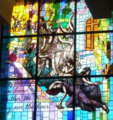 Is this a study of “survival of the fittest?”  Not quite…Our Lord, the master of the parable, gives these stories with meaning and serious intent.  Important messages are delivered directly, and really important messages come through parables.  Everything has important symbolism here – the bridegroom?  I think we know who that is, he is one there on the cross. He will come, not just for an earthly wedding, but for the Heavenly wedding banquet.  The virgins are basically bridesmaids for a Jewish wedding, awaiting the triumphal entry into the home of the new husband and wife; they could also be the saints who have gone before us, setting a good example.  They have come prepared with oil, and the lamps remain lit – notice the color of their flames in the stained-glass window.  It matches the radiant colors of their master’s glorious arrival.  There’s a reason for that!  The light that they radiate from their lamps flows from the light and goodness that he has shared with them.  Similarly, the love and good deeds that we show forth in our lives will radiate the same divine color, even in the smallest things, such as a smile, a kind greeting, holding the door for somebody – such is the power of Confirmation, when the Holy Spirit comes to us, and empowers everything we do, giving Divine Light and love to all our good deeds!  But we mustn’t be lazy, we mustn’t neglect the opportunity to love, because it will keep us spiritually awake and alive.  Those without oil, those who freely avoid deeds of love, will lose the light, and slumber in sin.  What allows Pope Benedict XVI to go on four hours of sleep?  What animated Mother Theresa with such vitality?  The light of God’s love, shining forth in their own lives, every single day!
