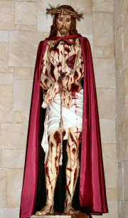 Narrator: Then he released Barabbas to them, but after he had Jesus scourged, he handed him over to be crucified. Then the soldiers of the governor took Jesus inside the praetorium and gathered the whole cohort around him. They stripped off his clothes and threw a scarlet military cloak about him. Weaving a crown out of thorns, they placed it on his head, and a reed in his right hand. And kneeling before him, they mocked him saying,