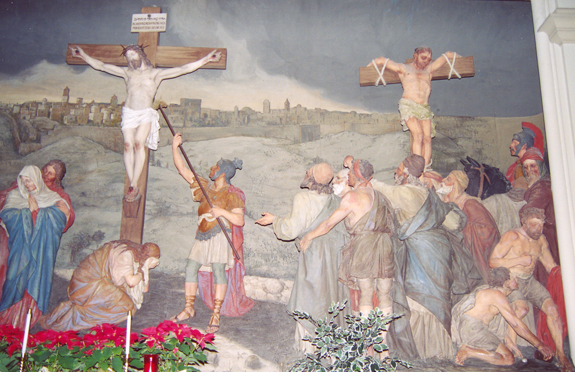 Narrator: They spat upon him and took the reed and kept striking him on the head. And when they had mocked him, they stripped him of the cloak, dressed him in his own clothes, and led him off to crucify him. As they were going out, they met a Cyrenian named Simon; this man they pressed into service to carry his cross. And when they came to a place called Golgotha - which means Place of the Skull - they gave Jesus wine to drink mixed with gall. But when he had tasted it, he refused to drink. After they had crucified him, they divided his garments by casting lots; then they sat down and kept watch over him there. And they placed over his head the written charge against him: This is Jesus, the King of the Jews. Two revolutionaries were crucified with him, one on his right and the other on his left. Those passing by reviled him, shaking their heads and saying,