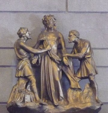 Jesus is stripped of his garments. Clothing gives a man his social position; it gives him his place in society, it makes him someone. His public stripping means that Jesus is no longer anything at all, he is simply an outcast, despised by all alike. The moment of the stripping reminds us of the expulsion from Paradise: God’s splendor has fallen away from man, who now stands naked and exposed, unclad and ashamed. And so Jesus once more takes on the condition of fallen man. Stripped of his garments, he reminds us that we have all lost the ”first garment” that is God’s splendor. At the foot of the Cross, the soldiers draw lots to divide his paltry possessions, his clothes. The Evangelists describe the scene with words drawn from Psalm 22:19; by doing so they tell us the same thing that Jesus would tell his disciples on the road to Emmaus: that everything takes place “according to the Scriptures”. Nothing is mere coincidence; everything that happens is contained in the Word of God and sustained by his divine plan. The Lord passes through all the stages and steps of man’s fall from grace, yet each of these steps, for all its bitterness, becomes a step towards our redemption: this is how he carries home the lost sheep. Let us not forget that John says that lots were drawn for Jesus’ tunic, “woven without seam from top to bottom” (Jn 19:23). We may consider this as a reference to the High Priest’s robe, which was “woven from a single thread”, without stitching (Fl. Josephus, a III, 161). For he, the Crucified One, is the true High Priest.