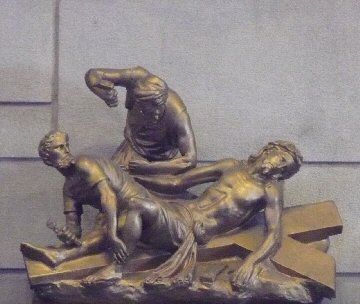 Jesus is nailed to the Cross. The shroud of Turin gives us an idea of the unbelievable cruelty of this procedure. Jesus does not drink the numbing gall offered to him: he deliberately takes upon himself all the pain of the Crucifixion. His whole body is racked; the words of the Psalm have come to pass: “But I am a worm and no man, scorned by men, rejected by the people” (Ps 22:7). “As one from whom men hide their faces, he was despised… surely he has borne our grief and carried our sorrows” (Is 53:3f). Let us halt before this image of pain, before the suffering Son of God. Let us look upon him at times of presumptuousness and pleasure, in order to learn to respect limits and to see the superficiality of all merely material goods. Let us look upon him at times of trial and tribulation, and realize that it is then that we are closest to God. Let us try to see his face in the people we might look down upon. As we stand before the condemned Lord, who did not use his power to come down from the Cross, but endured its suffering to the end, another thought comes to mind. Ignatius of Antioch, a prisoner in chains for his faith in the Lord, praised the Christians of Smyrna for their invincible faith: he says that they were, so to speak, nailed with flesh and blood to the Cross of the Lord Jesus Christ (1:1). Let us nail ourselves to him, resisting the temptation to stand apart, or to join others in mocking him.
