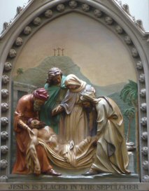 Jesus is laid there. Then Joseph, rolling a great stone, closes the