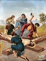 At the Last Supper, Jesus passed the cup of wine to his Apostles with the words, "Drink it all of you for this is my blood which will be poured out for many for the forgiveness of sin," and here on Calvary, the redeeming blood flows freely from his hands and feet as the nails are driven into the tender flesh. The barbarity of the scene is horrifying, yet in our own day brutality survives on a grand scale in the calculated cruelty of modern warfare and in the thoughtless violence within our own towns and cities.