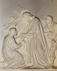 Let us pray: May the image of the suffering Savior be imprinted on our hearts and minds.  May we behold his countenance in the faces of the sick, and the poor and in the victims of injustice, war, persecution and famine.  Help us to act like Veronica here and now by practicing patience and compassion, putting up with one another's failings and helping one another at all times.  Amen.