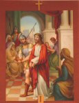 It is after ten in the morning.  The trial is moving to its close.  There has been no conclusive evidence.  The judge knows that his enemies have handed Jesus over to him out of envy, and he tries an absurd move: a choice between Barabbas, a criminal accused of robbery and murder, and Jesus, who says he is Christ.  The people choose Barabbas, and Pilate exclaims: What am I to do then, with Jesus?  They all reply: Crucify him!  The judge insists: Why, what evil has he done?  Once again they respond, shouting: Crucify him! Crucify him!  Pilate is frightened by the growing uproar.  So he sends for water, and washes his hands in the sight of the people, saying as he does so: I am innocent of the blood of this just man; it is your affair (Matt 27:24).