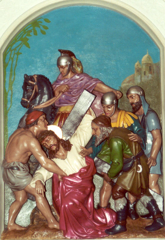 The cross is laid on Simon of Cyrene.
