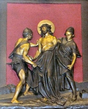 Jesus is stripped of his garments. Clothing gives a man his social position; it gives him his place in society, it makes him someone. His public stripping means that Jesus is no longer anything at all, he is simply an outcast, despised by all alike. The moment of the stripping reminds us of the expulsion from Paradise: God’s splendor has fallen away from man, who now stands naked and exposed, unclad and ashamed. And so Jesus once more takes on the condition of fallen man. Stripped of his garments, he reminds us that we have all lost the ”first garment” that is God’s splendor. At the foot of the Cross, the soldiers draw lots to divide his paltry possessions, his clothes. The Evangelists describe the scene with words drawn from Psalm 22:19; by doing so they tell us the same thing that Jesus would tell his disciples on the road to Emmaus: that everything takes place “according to the Scriptures”. Nothing is mere coincidence; everything that happens is contained in the Word of God and sustained by his divine plan. The Lord passes through all the stages and steps of man’s fall from grace, yet each of these steps, for all its bitterness, becomes a step towards our redemption: this is how he carries home the lost sheep. Let us not forget that John says that lots were drawn for Jesus’ tunic, “woven without seam from top to bottom” (Jn 19:23). We may consider this as a reference to the High Priest’s robe, which was “woven from a single thread”, without stitching (Fl. Josephus, a III, 161). For he, the Crucified One, is the true High Priest.