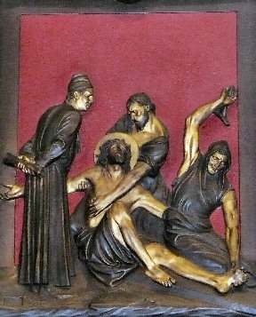 Jesus is nailed to the Cross. The shroud of Turin gives us an idea of the unbelievable cruelty of this procedure. Jesus does not drink the numbing gall offered to him: he deliberately takes upon himself all the pain of the Crucifixion. His whole body is racked; the words of the Psalm have come to pass: “But I am a worm and no man, scorned by men, rejected by the people” (Ps 22:7). “As one from whom men hide their faces, he was despised… surely he has borne our grief and carried our sorrows” (Is 53:3f). Let us halt before this image of pain, before the suffering Son of God. Let us look upon him at times of presumptuousness and pleasure, in order to learn to respect limits and to see the superficiality of all merely material goods. Let us look upon him at times of trial and tribulation, and realize that it is then that we are closest to God. Let us try to see his face in the people we might look down upon. As we stand before the condemned Lord, who did not use his power to come down from the Cross, but endured its suffering to the end, another thought comes to mind. Ignatius of Antioch, a prisoner in chains for his faith in the Lord, praised the Christians of Smyrna for their invincible faith: he says that they were, so to speak, nailed with flesh and blood to the Cross of the Lord Jesus Christ (1:1). Let us nail ourselves to him, resisting the temptation to stand apart, or to join others in mocking him.