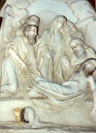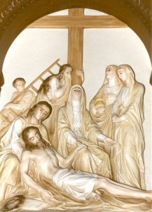 Mary stands by the Cross is engulfed in grief.  And John is beside her.  But it is getting late, and the Jews press for Our Lord to be removed from there.  Having obtained from Pilate the permission required by Roman law for the burial of condemned prisoners, there comes to Calvary a councilor named Joseph, a good and upright man, a native of Arimathea.  He has not consented to their counsel and their doings, but is himself one of those waiting for the kingdom of God (Luke 23:50-51).  With him too comes Nicodemus, the same who earlier visited Jesus by night; he brings with him a mixture of myrrh and aloes, about a hundred pounds weight (John 19:39).