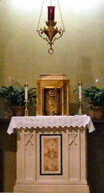 The Priest Approaches and Kisses the Altar: The altar is a symbol of Christ. In it are cut five crosses to recall the five wounds of Christ. The altar also represents the Church and has embedded in it the relics of her saints. The priest comes to the altar to celebrate the Sacrifice in the Church's name. Because of the glory surrounding the altar upon which the divine Sacrifice will be made, the kiss of the priest unites the Church to Christ, its Redeemer.