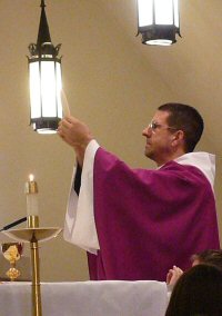 The Gospel:  The Liturgy of the Word is completed by the reading of the Gospel.  Before its reading, the members of the assembly trace the sign of the cross upon the forehead to indicate their mental acceptance of the Truth, on the lips to indicate their readiness to announce it, and over the heart to indicate their sincere desire to accept it into their lives.  The "Good News" of the Gospel tells that God's kingdom has come for all to hear, accept, and announce to the world for its salvation.  It is God who is speaking to us.  Christ comes to teach us by the example of His life and by His own words.