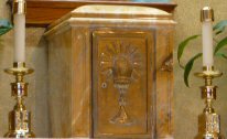 The Priest Approaches and Kisses the Altar: The altar is a symbol of Christ. In it are cut five crosses to recall the five wounds of Christ. The altar also represents the Church and has embedded in it the relics of her saints. The priest comes to the altar to celebrate the Sacrifice in the Church's name. Because of the glory surrounding the altar upon which the divine Sacrifice will be made, the kiss of the priest unites the Church to Christ, its Redeemer.