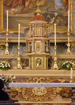 The Priest Approaches and Kisses the Altar:  The altar is a symbol of Christ.  In it are cut five crosses to recall the five wounds of Christ.  The altar also represents the Church and has embedded in it the relics of her saints.  The priest comes to the altar to celebrate the Sacrifice in the Church's name.  Because of the glory surrounding the altar upon which the divine Sacrifice will be made, the kiss of the priest unites the Church to Christ, its Redeemer.