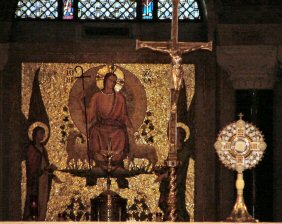 The Priest Approaches and Kisses the Altar: The altar is a symbol of Christ. In it are cut five crosses to recall the five wounds of Christ. The altar also represents the Church and has embedded in it the relics of her saints. The priest comes to the altar to celebrate the Sacrifice in the Church's name. Because of the glory surrounding the altar upon which the divine Sacrifice will be made, the kiss of the priest unites the Church to Christ, its Redeemer.
