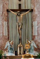 The Priest Approaches and Kisses the Altar: The altar is a symbol of Christ. In it are cut five crosses to recall the five wounds of Christ. The altar also represents the Church and has embedded in it the relics of her saints. The priest comes to the altar to celebrate the Sacrifice in the Church's name. Because of the glory surrounding the altar upon which the divine Sacrifice will be made, the kiss of the priest unites the Church to Christ, its Redeemer.