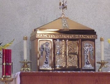 The Priest Approaches and Kisses the Altar: The altar is a symbol of Christ. In it are cut five crosses to recall the five wounds of Christ. The altar also represents the Church and has embedded in it the relics of her saints. The priest comes to the altar to celebrate the Sacrifice in the Church's name. Because of the glory surrounding the altar upon which the divine Sacrifice will be made, the kiss of the priest unites the Church to Christ, its Redeemer.