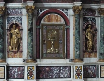 The Priest Approaches and Kisses the Altar: The altar is a symbol of Christ. In it are cut five crosses to recall the five wounds of Christ. The altar also represents the Church and has embedded in it the relics of her saints. The priest comes to the altar to celebrate the Sacrifice in the Church's name. Because of the glory surrounding the altar upon which the divine Sacrifice will be made, the kiss of the priest unites the Church to Christ, its Redeemer.