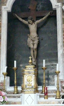 The Priest Approaches and Kisses the Altar: The altar is a symbol of Christ. In it are cut five crosses to recall the five wounds of Christ. The altar also represents the Church and has embedded in it the relics of her saints. The priest comes to the altar to celebrate the Sacrifice in the Church's name. Because of the glory surrounding the altar upon which the divine Sacrifice will be made, the kiss of the priest unites the Church to Christ, its Redeemer.